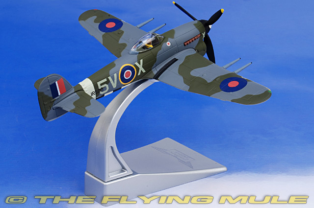 Corgi's 1:72 scale Typhoons feature a prominent pair of 20mm cannon barrels on the leading edge of each wing, vents for spent cannon shells and separately applied transparent landing lights. The characteristic radiator chin duct of this mid-war Mk 1b fighter-bomber is expertly modeled, with details of the radiator clearly visible through the large opening. The landing gear is easy to configure for ground display (most releases), with details of the wings' construction visible inside the wheel wells, and the large canopy provides a clear view of a detailed pilot figure. Ground attack releases also include a variety of weapons loads.