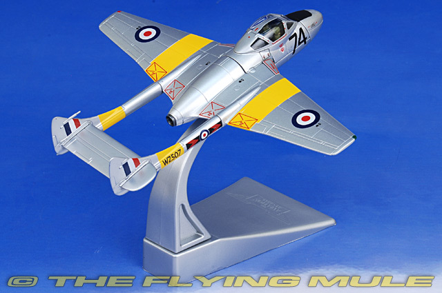 Corgi's 1:72 scale Vampires feature panel line detail that is exceptionally fine for a diecast metal model. Turbojet intakes are veined and individually painted with separately applied exhaust nozzle detailing at the rear. Four cannon and shell-casing ejection ports are located beneath the nose. The tail booms and elevators of this model are plastic, a feature designed to correct the model's center of gravity for proper ground display. The series includes a single-seat fighter-bomber and a two-seat trainer, with larger nose and canopy as well as redesigned twin rudders and larger elevators.
