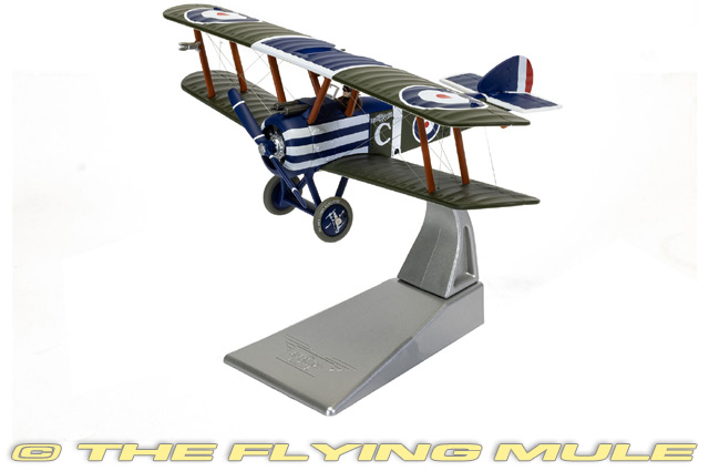 Corgi's 1:48 scale Camels are some of the most historically significant aircraft included in their WWI aircraft series. WWI fighters were relatively small in comparison to their WWII counterparts and 1:48 scale captures significant details that would be lost in smaller scales. The model uses fine gauge wire to represent the structurally significant bracing wires found on the actual aircraft. Additionally, the mold faithfully replicates the complex contours of the entire aircraft, simulating a stretched fabric covering. A detailed pilot figure sits behind the twin Vickers machine guns while the top wing includes the inboard cut-outs, so essential to the pilot's forward visibility in a dogfight. Up front, the propeller and engine are nicely detailed and free to rotate in unison behind the cowling, just as with the real aircraft. The model rests on rolling rubber tires that accurately reproduce the gray color vulcanized natural rubber takes on after prolonged exposure to sunlight.