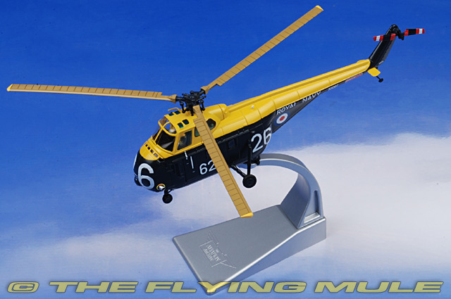 Corgi's 1:72 H-19/Whirlwind is constructed almost entirely in diecast metal with some plastic components used for scale replication such as its large multi-window canopy and rotor blades. The cargo bay door slides opens to reveal interior crew seating with pilot figures clearly seen through the top mounted canopy. An unusual feature of this model are the two easily changeable all metal rotor head assemblies that allow the model to be display with rotor blades folded back for storage or deployed for flight. The series covers the radial-engined Sikorsky H-19 Chickasaw variants and the turbine-engined Westland Whirlwind variants.