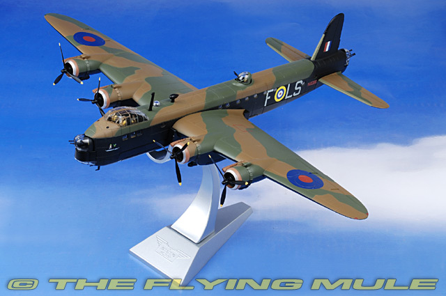 Corgi's 1:72 scale Stirling is a large model in this scale, cleverly constructed in diecast metal with plastic components used in areas such as turrets and engines for maximum scale detail. The fuselage features transparent side mounted windows and the large cockpit canopy provides for easy viewing of crew figures. Each of the nose, dorsal and aft turrets can rotate and includes elevating machine guns. The central and internal wing bomb-bay compartments are constructed as subassemblies for quick and easy configuration. The model can be display on its gear, or quickly configured for display on its heavily constructed all-metal display stand.