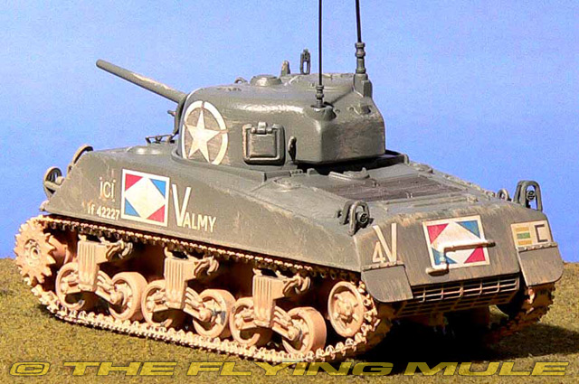 This M4 A2 was used extensively by the French armored division during much of the fighting in Southern France in 1944 following the Allied landings in Toulon and Marseilles. The DB used the tricolor national marking with a white diamond center as shown on the model. The red and blue sections were occasionally painted out when on active service, leaving only the white diamond.
