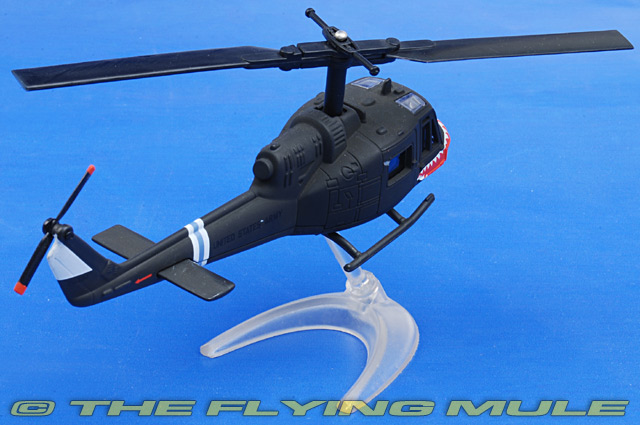 The 174th AHC "Sharks", arrived in Vietnam with the fronts of their Hueys painted the factory subdued olive green and black. The only distinguishing marks were the white "triangular fin" painted on the vertical stabilizer at the end of the tail boom. Early in 1966 the unit officially asked for and received permission from the famous Flying Tigers of WWII to adapt their P-40 Warhawk's sharks-mouth paint scheme to the Shark's helicopters. Permission was received in June 1966, and every Shark from then on until the unit stood down at the end of 1971 proudly bared those famous teeth into combat. While numerous USAF jets and some AH-1G Cobra helicopters used the shark's mouth in Vietnam, the 174th Sharks were the only UH-1 Huey gunships in the entire war to sport the shark's teeth, and the only unit to get "official permission" from the Flying Tigers to do so. Designed to meet a US Army requirement for a medical evacuation (MEDEVAC) and general utility helicopter, the UH-1 Huey was first flown on October 20, 1956. Nicknamed "Huey" because of its original "HU-1" designation, this aircraft became famous during the Vietnam War, where 7,000 of them served in a variety of roles, from MEDEVAC and search and rescue to troop transport, air assault and ground attack. As a troop transporter, the Huey revolutionized warfare, giving the Army the ability to strategically position troops in various locations that were otherwise difficult to reach in the heavy jungle environment. © Copyright 2003-2025 The Flying Mule, Inc. The Corgi "Showcase Collection" range presents affordable, ready-made diecast models of military and civilian aircraft. Corgi "Showcase Collection" diecast airplanes feature: - Diecast metal construction with some plastic components.