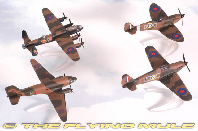 The Battle of Britain Memorial Flight (BBMF) is a Royal Air Force flight which provides an aerial display group comprising an Avro Lancaster, a Supermarine Spitfire and a Hawker Hurricane. The aircraft are regularly seen at events commemorating World War II, upon British State occasions and at air displays throughout the United Kingdom and Europe. The Flight is administratively part of No. 1 Group RAF, flying out of RAF Coningsby in Lincolnshire. Designed to meet a specification for a new generation of "worldwide use" medium bombers, the Avro Lancaster was first flown on January 8, 1941. The design of the Lancaster evolved from an unsuccessful two-engine aircraft called the Manchester. The heavier Lancaster had four engines and an extensive bomb bay, with later versions capable of carrying 22,000 lb bombs. Used primarily as a night bomber, the Lancaster was a versatile aircraft that became most famous for its role in the 1943 "Dam Buster" raids on Germany's Ruhr Valley dams. Between 1942 and 1945, Lancasters flew 156,000 sorties, dropping 608,612 tons of bombs on enemy targets. © Copyright 2003-2025 The Flying Mule, Inc. Designed to meet an American Airlines requirement for an enlarged version of the DC-2, the DC-3 was first flown on December 17th, 1935. Capable of carrying 24 passengers at a cruising speed of 180 mph, the DC-3's speed and long range revolutionized commercial air travel in the 1930s and 40s, when it carried 90 percent of the world's air travelers. Early DC-3s used Wright R-1820 Cyclone engines, but Pratt & Whitney R-1830 Twin Wasp Radials were fitted to later versions; these engines had better single engine performance and allowed the DC-3 to fly at higher altitudes. © Copyright 2003-2025 The Flying Mule, Inc. Designed by R.J.Michell to meet a British Air Ministry specification, the Supermarine Spitfire first flown on March 5th, 1936. With its combination of beautiful fighter design, the excellent performance of its Rolls-Royce Merlin powerplant and firepower provided by twin cannons and four machine guns, the Spitfire became an unrivaled symbol of victory. The Spitfire had 40 major variants and was built in greater numbers than any other British aircraft of the time. It flew operationally on every front between 1939 and 1945 and was engaged in every one of the Royal Air Force's major actions. © Copyright 2003-2025 The Flying Mule, Inc. Based on the Fury biplane and designed by Sydney Camm as a monoplane fighter, the Hurricane was first flown on November 6th, 1935. With its wide-set landing gear, easy handling, reliability, and stable gun platform, the Hurricane was suitable for a variety of different roles such as intruder, ground strafing and night fighter. Steel-tube construction meant cannon shells could pass right through the wood and fabric covering without exploding. The Hurricane underwent many modifications during its lifetime, including an upgraded Merlin engine and interchangeable multi-purpose wings, staging twelve 7.7mm guns and two 40mm anti-tank guns and carrying two 500lb bombs. © Copyright 2003-2025 The Flying Mule, Inc. The Corgi "Showcase Collection" range presents affordable, ready-made diecast models of military and civilian aircraft. Corgi "Showcase Collection" diecast airplanes feature: - Diecast metal construction with some plastic components.
