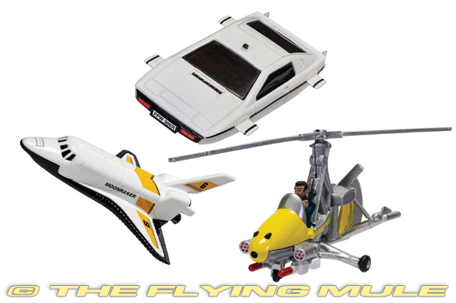James Bond isn't just restricted to the use of beautiful cars in his adventures. This triple pack features the "Little Nellie" autogyro from "You Only Live Twice", the Lotus Esprit submarine from "The Spy Who Loved Me", and the "Moonraker" space shuttle as a showcase of the more unusual alternative modes of transport 007 has made use of to fulfil his missions.