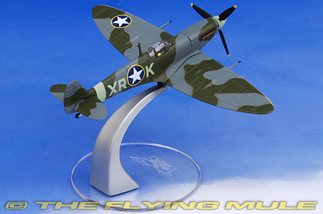 Corgi's 1:72 scale Spitfire series includes many versions of this famous aircraft, from Mk I to the Griffon-engined variants with five bladed propellers. The characteristic under-wing mounted pitot tube and offset radiator and oil cooler ducts are mounted below the solid metal wings with a variety of machine guns and cannons. The all metal horizontal stabilizers and rudder feature simulated fabric stretched control surfaces. On some releases, the top engine cowing is removable to reveal engine detail engine and exhaust detail. The model is constructed almost entirely of solid diecast metal and feels surprisingly heavy in this scale.
