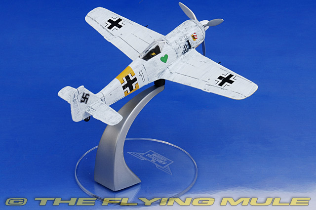 Corgi's 1:72 scale Fw 190A series includes models from all major theaters of action, from the Channel Front to the deserts of North Africa. Corgi has captured the many unique features of this aircraft, including the 12 bladed fan inside the engine cowl that spins in unison with the propeller to cool the engine. The solid metal tail and wings feature simulated fabric-stretched control surfaces. On releases with configurable landing gear or gear fixed in the down position, inner details of the wing's construction and barrels of the inboard cannons can be seen inside the wheel wells, with vents for spent shell casing behind.