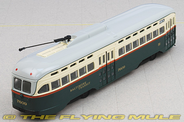 Corgi's 1:50 scale PCC Streetcar has a chassis that is constructed entirely of diecast metal. When held to the light, a fully rendered passenger cabin and conductor station can be viewed through the multitude of individual transparent windows. The front of the car features a pad-printed route/destination, separately applied wipers, transparent headlight and bumper. The pole on the top of the car rotates and pivots and can be raised or lowered for display. On the underside are two pairs of pivoting axels with rotating metal track wheels and simulated wooden racks and bumpers.