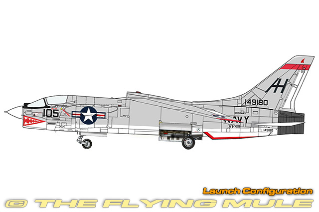 Century Wings' 1:72 scale F-8 Crusader series is masterfully modeled; joining seam lines blend almost undetectably with the model's panel lines. These F-8s feature metal horizontal stabilizers that rotate in unison and a pivoting main wing, which replicates the wing's position during take-offs and landings. There are removable bomb loads under each wing and three different ordnance configurations for mounting on the sides of the fuselage. The canopy opens to reveal a highly detailed cockpit interior and leaves no gaps when snapped shut. Special releases in this series feature a "launch configuration," with wing flaps and forward leading edges permanently in the deployed position.
