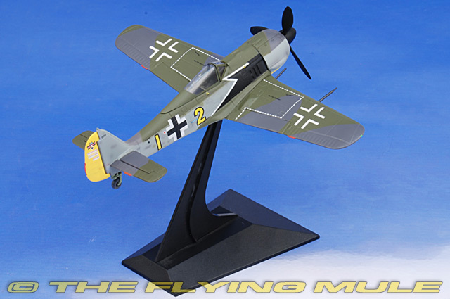 The mold for the Fw 190 also allows for both the early war "A" model and late war long-nose "D" model to be produced, with separate castings for each fuselage. The paint schemes are expertly airbrushed to bring out the subtleties of the panel lines, rivets, control surface detail and trim tabs. Pad-printed unit markings and finely detailed placards complete this historically accurate model. The elevators and rudder are hinged and movable, which is uncommon in 1:72 scale. The sliding canopy opens to reveal a fully detailed cockpit with pad-printed instruments and side panels.