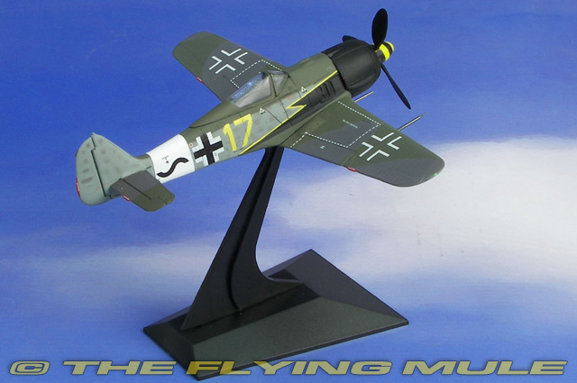 The mold for the Fw 190 also allows for both the early war "A" model and late war long-nose "D" model to be produced, with separate castings for each fuselage. The paint schemes are expertly airbrushed to bring out the subtleties of the panel lines, rivets, control surface detail and trim tabs. Pad-printed unit markings and finely detailed placards complete this historically accurate model. The elevators and rudder are hinged and movable, which is uncommon in 1:72 scale. The sliding canopy opens to reveal a fully detailed cockpit with pad-printed instruments and side panels.