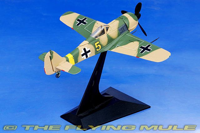 The mold for the Fw 190 also allows for both the early war "A" model and late war long-nose "D" model to be produced, with separate castings for each fuselage. The paint schemes are expertly airbrushed to bring out the subtleties of the panel lines, rivets, control surface detail and trim tabs. Pad-printed unit markings and finely detailed placards complete this historically accurate model. The elevators and rudder are hinged and movable, which is uncommon in 1:72 scale. The sliding canopy opens to reveal a fully detailed cockpit with pad-printed instruments and side panels.