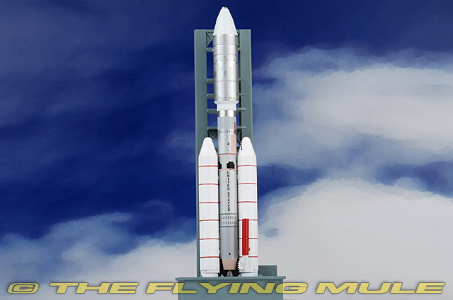 Now collectors and space enthusiasts can recreate the dramatic launch of a Titan IIIE with Dragon's newest 1/400 scale model. The new Dragon Space miniature shows an impressive Titan IIIE rocket positioned on its SLC-41 launch pad awaiting blastoff from Cape Canaveral. The pre-painted model is highly accurate and is fully detailed, including correct sequences of markings. It comes with its special high-specific-impulse Centaur upper stage, which gives it a very different appearance to the Titan IIIC released previously. The metallic color of this upper stage is authentically reproduced. The model also features two huge strap-on solid rocket boosters. For folk who wish to feel the power of a Titan rocket launch, this is a must-have item!