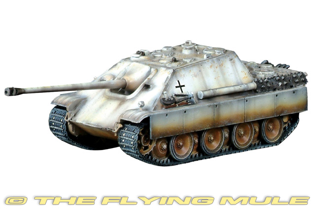 | MAN Sd.Kfz.173 Jagdpanther | | 3.75" | | 2" | First built in Nazi Germany in 1944, the Jagdpanther was a 46-ton tank destroyer powered by a 12 cylinder gasoline engine and operated by a five-man crew. The driver had a periscope and vision slots and additional periscopes were mounted on the roof of the superstructure for the commander and loader. Its "no turret" design was built on the chassis of the Panther tank. It carried an 88mm gun and was protected by heavy sloped armor. The outcome of this design was a low-silhouette extremely high quality vehicle with tremendous firepower that many historians believe to be the best tank destroyer of the war. © Copyright 2003-2025 The Flying Mule, Inc. The Dragon Models "1:72 Dragon Armor Collector Series" range presents highly-detailed, ready-made plastic models of military vehicles. Dragon Armor tanks require no glueing or painting. Each model is an instant display piece or diorama centerpiece straight from the box and is 100% true to scale... these don't look like model tanks, they look like tanks!. Color, camouflage and unit markings are carefully researched for Maximum authenticity, marking the difference between and authentic scale model tank and a "toy" tank. Dragon Models "1:72 Dragon Armor Collector Series" display model vehicles feature: - Molded plastic construction (some releases include diecast metal components).