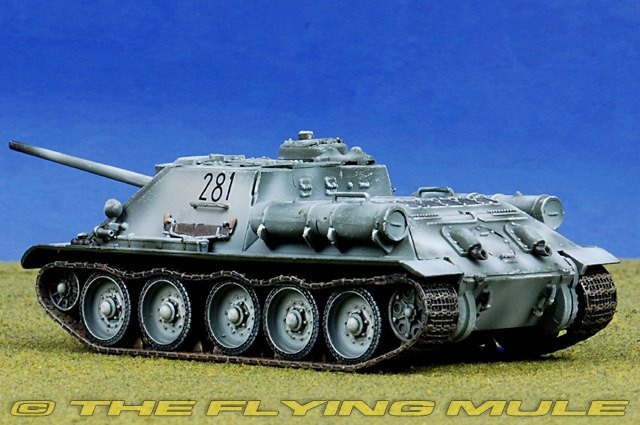 Dragon's 1:72 scale SU-85 is constructed entirely from plastic, which allows for the finest possible detailing. Close scrutiny of this model reveals welding beads, finely-simulated engine intake screens, cutting torch marks on the edges of the armor plates, the bell cranks of the Christie suspension and delicate hand rails on each side of the hull. When viewed up close, hexagonal nuts and bolt ends are visible on the road wheels. Equipment such as spare tracks and a two-man saw has been separately applied to the hull, and the mantlett on the elevating cannon barrel has a pitted texture resembling that of the real piece