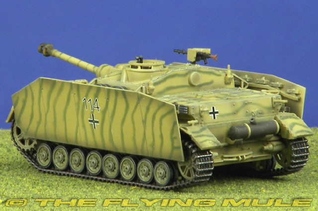 This model features an airbrushed three-color camo scheme complete with armor side skirts that fought on the Eastern Front in the summer of 1944. The Mid-Production model of the German StuG IV featured a Saukopfblende (pig's head) mantlet that was introduced in February of 1944, as well as a remote-controlled MG34 machine gun mount on the superstructure roof.