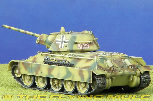 Dragon's 1:72 scale T-34 medium tanks are true collector's pieces. The top portion of the model's hull and turret is constructed entirely of diecast plastic, which allows for the greatest possible detail, and the lower hull is constructed of diecast metal. Each release features a 360-degree rotating turret with elevating cannon and a variety of battlefield equipment configurations separately attached to the hull, such as tow cables, spare tracks and tools. The series includes early variants as well as mid-war production variants with notable upgrades such as a commander's cupola and a larger mid-war hexagonal shaped cast turret.
