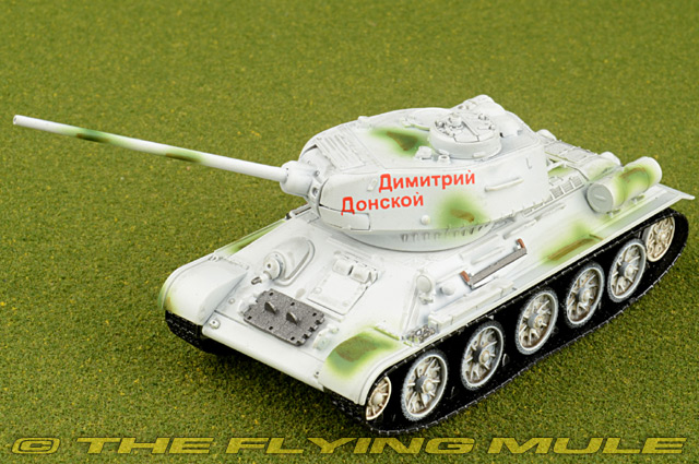 Dragon's 1:72 scale T-34 medium tanks are true collector's pieces. The top portion of the model's hull and turret is constructed entirely of diecast plastic, which allows for the greatest possible detail, and the lower hull is constructed of diecast metal. Each release features a 360-degree rotating turret with elevating cannon and a variety of battlefield equipment configurations separately attached to the hull, such as tow cables, spare tracks and tools. The series includes early variants as well as mid-war production variants with notable upgrades such as a commander's cupola and a larger mid-war hexagonal shaped cast turret.