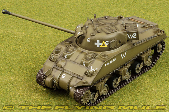 Dragon's 1:72 scale M4 Sherman is constructed almost entirely of diecast plastic, which provides for the greatest possible level of detailing. Featuring a 360-degree rotating turret with elevating cannon, this model has hatches, hinges, welded amour plating and a turret that are all stunningly accurate, and the same level of detailing has been applied to the vehicle's track system. The model's underside features forward crew escape hatch, engine compartment access panels and wheel suspension components. Additional detailing includes delicate guards that shield both head lamps and textured lenses and tail lights. Subtle airbrushed weathering with hand-painted tools and equipment add a finishing touch.
