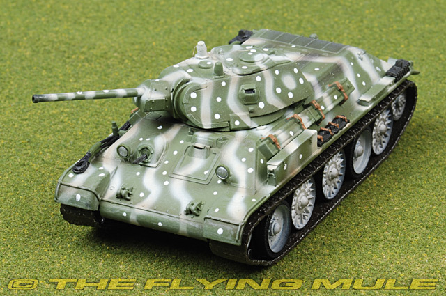 Dragon's 1:72 scale T-34 medium tanks are true collector's pieces. The top portion of the model's hull and turret is constructed entirely of diecast plastic, which allows for the greatest possible detail, and the lower hull is constructed of diecast metal. Each release features a 360-degree rotating turret with elevating cannon and a variety of battlefield equipment configurations separately attached to the hull, such as tow cables, spare tracks and tools. The series includes early variants as well as mid-war production variants with notable upgrades such as a commander's cupola and a larger mid-war hexagonal shaped cast turret.