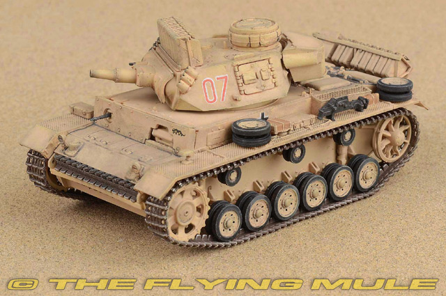 The Panzer III was a medium-class tank that, at the outbreak of WWII, was designed to be the primary platform of Germany's all-conquering panzer divisions. However, with the advent of more heavily armored and up-gunned enemy tanks, the role of the Panzer III became secondary to that of the Panzer IV. Production finally ceased in 1943.