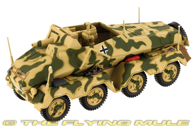 Designed as a heavily-armored reconnaissance vehicle with the mission of observing enemy forces, the Schwerer PanzerspƤhwagen first entered service in the mid 1930s. Originally based on a 6x4 truck design, these large but fast armored vehicles evolved to include eight-wheel designs. Though not meant to engage enemy forces, PanzerspƤhwagens could withstand small arms fire and could return fire with a 2 cm KwK 30 L/55 autocannon. These vehicles were operated throughout the war, though the extreme conditions in the USSR and North Africa limited their usefulness. © Copyright 2003-2026 The Flying Mule, Inc.