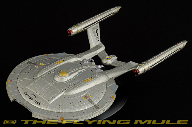 Models in the Eaglemoss "Mega" series are approximately twice the size of their standard releases. One of the most important starships in interstellar history, Enterprise (NX-01) was the culmination of the NX Project. The NX-01 was the first NX-class starship, launched by the United Earth Starfleet in 2151. Enterprise established United Earth as a legitimate interstellar power and caused a wholesale revolution in Alpha and Beta Quadrant politics, paving the way for the creation of the Coalition of Planets in 2155, and eventually the United Federation of Planets in 2161.