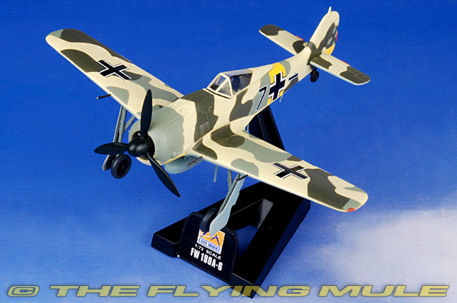 | Focke-Wulf Fw 190A | | 4.75" | | 5.75" | Designed by Kurt Tank, the Fw-190A was first flown on June 1st, 1939. This small, yet ferociously-powered aircraft was fast and maneuverable and packed a fierce armament package earning it the nickname "Butcher Bird". The wide landing gear, excellent visibility and high-altitude paddle-bladed propeller endeared it to pilots familiar with the shortcomings of its predecessor - the Messerschmitt Bf 109. Some of the Luftwaffe's most famous fighter aces flew the Fw 190. Many variants were produced during the war, with the most notable being the inline-engine equipped and longer-nosed 190D, known as the "Dora." © Copyright 2003-2025 The Flying Mule, Inc. The Easy Model "Platinum Collection" range presents highy-affordable, ready-made plastic models of military aircraft. While these models may not have the same "heft" as their diecast siblings, they do offer remarkable value for money. Most importantly, they look perfectly at home alongside diecast modes, allowing collectors to "flesh out" their collection with types and paint-schemes not yet available in diecast. Easy Model "Platinum Collection" display model airplanes feature: - Molded plastic construction.