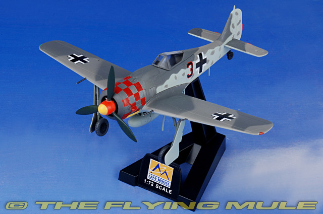 | Focke-Wulf Fw 190A | | 4.75" | | 5.75" | Designed by Kurt Tank, the Fw-190A was first flown on June 1st, 1939. This small, yet ferociously-powered aircraft was fast and maneuverable and packed a fierce armament package earning it the nickname "Butcher Bird". The wide landing gear, excellent visibility and high-altitude paddle-bladed propeller endeared it to pilots familiar with the shortcomings of its predecessor - the Messerschmitt Bf 109. Some of the Luftwaffe's most famous fighter aces flew the Fw 190. Many variants were produced during the war, with the most notable being the inline-engine equipped and longer-nosed 190D, known as the "Dora." © Copyright 2003-2025 The Flying Mule, Inc. The Easy Model "Platinum Collection" range presents highy-affordable, ready-made plastic models of military aircraft. While these models may not have the same "heft" as their diecast siblings, they do offer remarkable value for money. Most importantly, they look perfectly at home alongside diecast modes, allowing collectors to "flesh out" their collection with types and paint-schemes not yet available in diecast. Easy Model "Platinum Collection" display model airplanes feature: - Molded plastic construction.