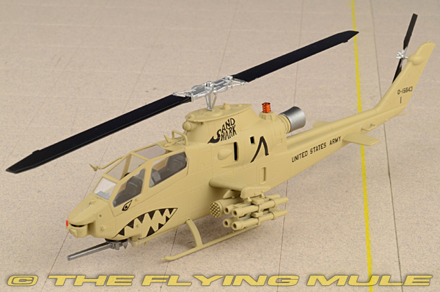 The Bell AH-1 Cobra is a two-blade, single engine attack helicopter manufactured by Bell Helicopter. It was developed using the engine, transmission and rotor system of the Bell's UH-1 Iroquois. The AH-1 is also referred to as the HueyCobra or Snake. The AH-1 was the backbone of the United States Army's attack helicopter fleet, but has been replaced by the AH-64 Apache in Army service. Upgraded versions continue to fly with the militaries of several other nations. The AH-1 twin engine versions remain in service with United States Marine Corps (USMC) as the service's primary attack helicopter. Designed to meet an urgent US Army requirement for a helicopter gunship, the Bell AH-1 Cobra-sometimes called The Snake-was first flown on September 7th, 1965. Troop-carrying Hueys depended on the Cobra for fire support; it was fast and very maneuverable, and its narrow 38-inch airframe made for a difficult target. Its main armament was its three-barrel 20mm Gatling gun mounted in a chin turret, but it was also capable of using a variety of other weapons including rocket pods, cannon pods, minigun pods and missiles. Replaced by Apaches in the 1990s, the Cobra now serves the US Forest Service as a firefighter. © Copyright 2003-2025 The Flying Mule, Inc. The Easy Model "Platinum Collection" range presents highy-affordable, ready-made plastic models of military aircraft. While these models may not have the same "heft" as their diecast siblings, they do offer remarkable value for money. Most importantly, they look perfectly at home alongside diecast modes, allowing collectors to "flesh out" their collection with types and paint-schemes not yet available in diecast. Easy Model "Platinum Collection" display model airplanes feature: - Molded plastic construction.