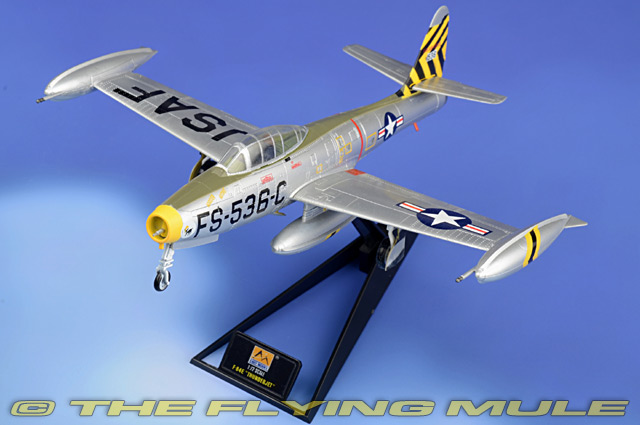 | Republic F-84E Thunderjet | | 7.25" | | 5.75" | Designed to meet a US Army requirement for a turbojet "day fighter," the F-84 first flew on February 28, 1946. Early models suffered from so many structural and engine problems that the Air Force considered scrapping the F-84 project in 1948, but designers rallied and by 1949 the F-84D was fully operational and free from most of its earlier problems. The aircraft became the Air Force's primary strike aircraft during the Korean War, and could claim several firsts, including the first fighter capable of carrying a nuclear weapon and the first to use in-flight refueling. © Copyright 2003-2025 The Flying Mule, Inc. The Easy Model "Platinum Collection" range presents highy-affordable, ready-made plastic models of military aircraft. While these models may not have the same "heft" as their diecast siblings, they do offer remarkable value for money. Most importantly, they look perfectly at home alongside diecast modes, allowing collectors to "flesh out" their collection with types and paint-schemes not yet available in diecast. Easy Model "Platinum Collection" display model airplanes feature: - Molded plastic construction.