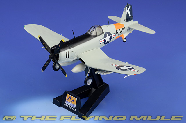 Designed to meet a US Navy requirement for a single-seat carrier based fighter, the F4U was first flown on May 29th, 1940. This versatile aircraft saw service with both the Navy and Marine Corps in WW II and in the Korean War. During its lifetime, the Corsair underwent numerous improvements such as a lengthened fuselage, a high visibility bubble-top canopy and folding inverted gull wings that provided clearance for a large propeller. Its performance advantage, 400 mph capability, the ability to withstand punishment and six .50 Browning machine guns made the F4U a devastating weapon against aircraft, ground targets and ships.