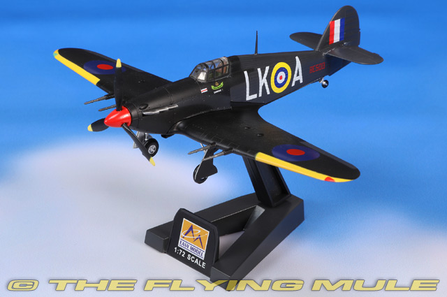 The first of the Royal Air Force's eight-gun monoplane fighters, the Hurricane entered service in 1937. Quantity production prior to the outbreak of World War II enabled the RAF to field no fewer than 2,300 Hurricanes in the summer of 1940. Always outnumbering its more famous counterpart during the Battle of Britain, the Hurricane is credited with the destruction of more enemy aircraft than any other type in the defense of the United Kingdom. Based on the Fury biplane and designed by Sydney Camm as a monoplane fighter, the Hurricane was first flown on November 6th, 1935. With its wide-set landing gear, easy handling, reliability, and stable gun platform, the Hurricane was suitable for a variety of different roles such as intruder, ground strafing and night fighter. Steel-tube construction meant cannon shells could pass right through the wood and fabric covering without exploding. The Hurricane underwent many modifications during its lifetime, including an upgraded Merlin engine and interchangeable multi-purpose wings, staging twelve 7.7mm guns and two 40mm anti-tank guns and carrying two 500lb bombs. © Copyright 2003-2025 The Flying Mule, Inc. The Easy Model "Platinum Collection" range presents highy-affordable, ready-made plastic models of military aircraft. While these models may not have the same "heft" as their diecast siblings, they do offer remarkable value for money. Most importantly, they look perfectly at home alongside diecast modes, allowing collectors to "flesh out" their collection with types and paint-schemes not yet available in diecast. Easy Model "Platinum Collection" display model airplanes feature: - Molded plastic construction.