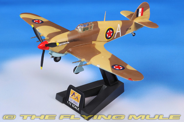 The first of the Royal Air Force's eight-gun monoplane fighters, the Hurricane entered service in 1937. Quantity production prior to the outbreak of World War II enabled the RAF to field no fewer than 2,300 Hurricanes in the summer of 1940. Always outnumbering its more famous counterpart during the Battle of Britain, the Hurricane is credited with the destruction of more enemy aircraft than any other type in the defense of the United Kingdom. Based on the Fury biplane and designed by Sydney Camm as a monoplane fighter, the Hurricane was first flown on November 6th, 1935. With its wide-set landing gear, easy handling, reliability, and stable gun platform, the Hurricane was suitable for a variety of different roles such as intruder, ground strafing and night fighter. Steel-tube construction meant cannon shells could pass right through the wood and fabric covering without exploding. The Hurricane underwent many modifications during its lifetime, including an upgraded Merlin engine and interchangeable multi-purpose wings, staging twelve 7.7mm guns and two 40mm anti-tank guns and carrying two 500lb bombs. © Copyright 2003-2025 The Flying Mule, Inc. The Easy Model "Platinum Collection" range presents highy-affordable, ready-made plastic models of military aircraft. While these models may not have the same "heft" as their diecast siblings, they do offer remarkable value for money. Most importantly, they look perfectly at home alongside diecast modes, allowing collectors to "flesh out" their collection with types and paint-schemes not yet available in diecast. Easy Model "Platinum Collection" display model airplanes feature: - Molded plastic construction.