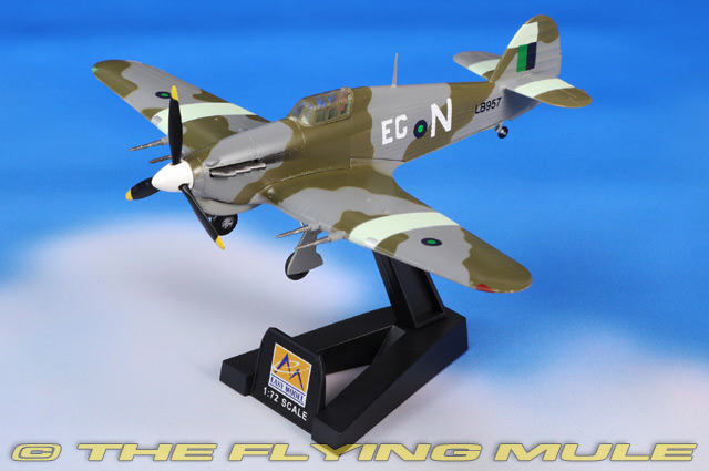 The first of the Royal Air Force's eight-gun monoplane fighters, the Hurricane entered service in 1937. Quantity production prior to the outbreak of World War II enabled the RAF to field no fewer than 2,300 Hurricanes in the summer of 1940. Always outnumbering its more famous counterpart during the Battle of Britain, the Hurricane is credited with the destruction of more enemy aircraft than any other type in the defense of the United Kingdom. Based on the Fury biplane and designed by Sydney Camm as a monoplane fighter, the Hurricane was first flown on November 6th, 1935. With its wide-set landing gear, easy handling, reliability, and stable gun platform, the Hurricane was suitable for a variety of different roles such as intruder, ground strafing and night fighter. Steel-tube construction meant cannon shells could pass right through the wood and fabric covering without exploding. The Hurricane underwent many modifications during its lifetime, including an upgraded Merlin engine and interchangeable multi-purpose wings, staging twelve 7.7mm guns and two 40mm anti-tank guns and carrying two 500lb bombs. © Copyright 2003-2025 The Flying Mule, Inc. The Easy Model "Platinum Collection" range presents highy-affordable, ready-made plastic models of military aircraft. While these models may not have the same "heft" as their diecast siblings, they do offer remarkable value for money. Most importantly, they look perfectly at home alongside diecast modes, allowing collectors to "flesh out" their collection with types and paint-schemes not yet available in diecast. Easy Model "Platinum Collection" display model airplanes feature: - Molded plastic construction.