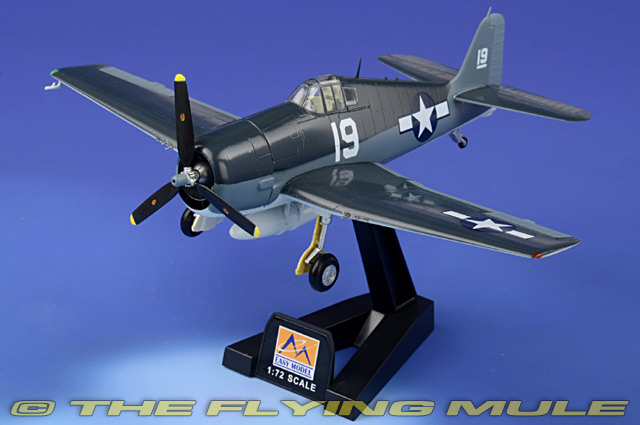 The F6F included provisions for carrying additional external fuel tanks or two 1,000lb. bombs, stubs for launching six HVAR 5in. rockets and an alternate armament arrangement consisting of two 20mm cannon and four 50cal. machine guns or the standard six 50cal. guns. A smoother, closer-fitting cowling was installed around the P&W R2800-10W engine. At 23,000 ft. the F6F-5 would fly at 380mph, taking only seven minutes to climb to 20,000 ft. The rear window was removed on all but a few of the early F6F-5s. 930 of this model Hellcat were provided to England during WWII, and later in smaller quantities to France and Uruguay. Developed by Grumman to combat the Japanese Zero, the carrier-based F6F Hellcat was first flown on June 26, 1942. The Hellcat was a far more potent force than its predecessor, the Wildcat. It had increased fuel capacity, a low-mounted wing, wide landing gear, strengthened cockpit armor plating, and increased ammunition capacity. The big Double Wasp engine was set three degrees off the center axis, giving the aircraft a tail-down attitude in flight. Pilots' stories of "mostly holes where the airplane used to be" underscore the Hellcat's ability absorb unbelievable punishment and still return to the ship. © Copyright 2003-2025 The Flying Mule, Inc. The Easy Model "Platinum Collection" range presents highy-affordable, ready-made plastic models of military aircraft. While these models may not have the same "heft" as their diecast siblings, they do offer remarkable value for money. Most importantly, they look perfectly at home alongside diecast modes, allowing collectors to "flesh out" their collection with types and paint-schemes not yet available in diecast. Easy Model "Platinum Collection" display model airplanes feature: - Molded plastic construction.
