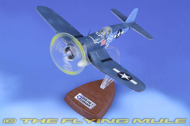 Forces of Valor's 1:72 scale Corsair is constructed almost entirely from diecast metal, and many of its features are similar to those seen only in higher-priced models. The solid metal wing includes many fine details such as oil cooler vents and machine gun ports. Radial engine details are visible inside the engine cowling, and exhaust stains can be seen through the expanded cowl flaps. The landing gear wheel wells and the tail wheel assembly are also highly detailed and the horizontal stabilizers and rudder have simulated fabric-stretched control surfaces.