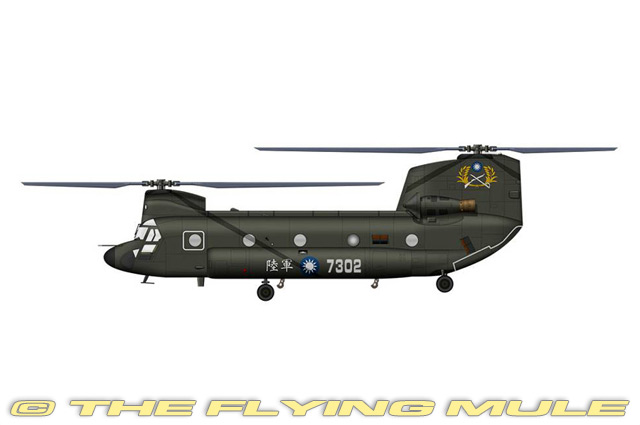 The CH-47SD or "Super D" Chinook tandem-rotor helicopter is the new standard CH-47 model. Although aimed primarily at the international market, the rotorcraft also will be available to the U.S. armed forces. The new Boeing "Super D" Chinook completed its first test Flight on August 26, 1999. The Boeing Company began production of the CH-47SD in March 1998. On 05 January 2000 Boeing announced that it had signed a contract calling for the delivery of nine CH-47SD (Super D) Chinook helicopters to Taiwan under a Foreign Military Sale agreement with the U.S. government. The procurement, valued in excess of $300 million, includes logistical support. Deliveries began in 2001. Designed as a turbine-powered replacement for the CH-37 Mojave, the CH-47 was first flown on September 21st, 1961. This iconic helicopter has had a long service history, seeing action in many different wars, from Vietnam to Afghanistan. The Chinook is the U.S. Army's heaviest-lifting helicopter, primarily serving as a troop transporter, with secondary roles including artillery emplacement and battlefield resupply. It has a crew of three and can move 55 combat-ready troops. Its wide-loading ramp can be opened in-flight for paratroopers, and three cargo hooks can extend through a floor hatch, which allows the Chinook to be used as a flying crane. © Copyright 2003-2025 The Flying Mule, Inc. The Waltersons "Forces of Valor" range presents detailed, ready-made diecast models of military aicraft. Waltersons "Forces of Valor" diecast airplanes feature: - Diecast metal construction with some plastic components.