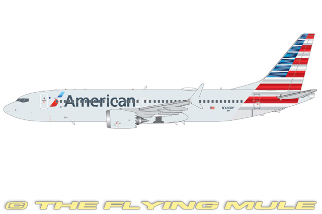 Boeing 737-8 MAX, construction number 44454, was delivered to American Airlines as N326RP in 2021 as part of the airline's narrowbody fleet modernization program. The aircraft operates short and medium haul routes across North America, the Caribbean, and Central America from major hubs such as Dallas Fort Worth, Miami, and Charlotte. N326RP features American's modern single aisle cabin with first class, Main Cabin Extra, and economy seating, along with updated inflight entertainment and connectivity. Powered by CFM LEAP-1B engines, the 737 MAX 8 offers improved fuel efficiency, reduced emissions, and lower operating costs compared with earlier 737 generations. Please note: An optional display stand is available separately if you wish to display this model "in-flight". The Boeing 737 MAX is an American narrow-body aircraft series being developed by Boeing Commercial Airplanes as the fourth generation of the Boeing 737, succeeding the Boeing 737 Next Generation. The first flight was on January 29, 2016. The 737 MAX is based on earlier 737 designs but re-engined with more efficient CFM International LEAP-1B along with aerodynamic improvements, most notably split-tip winglets, and airframe modifications. It is offered in three lengths, the 737 MAX 7, MAX 8 and MAX 9 replacing the 737-700, -800 and -900, typically offering 138 to 220 seats and a 3,515 to 3,825 nmi range. © Copyright 2003-2026 The Flying Mule, Inc. The GeminiJets "Gemini 200" range presents higly-detailed, ready-made diecast models of civilian and military aircraft in 1:200 scale. Prized by collectors worldwide, Gemini define the benchmark by which other 1:200 aircraft brands are judged. GeminiJets "Gemini 200" diecast airplanes feature: - Diecast metal construction, including wings and tail surfaces.