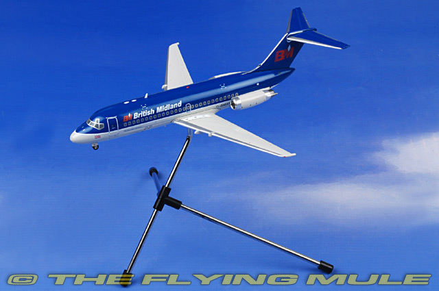 Gemini's 1:200 scale DC-9 series jetliners have a higher metal content than almost any other 1:200 model. The fuselage features a solid all around seamless construction with pad-printed windows and doors, fine photo-etched antennas and glimmering jewel-cut anti-collision lenses on top and bottom. The solid metal wings feature subtle panel lines and integrated flap track fairings on the underside. The aft fuselage features all-metal tail surfaces and rear mounted engine nacelles with turbo fan details inside. The series covers the early DC-9s and the updated MD-80/90 Series with stretched fuselages and larger wings.