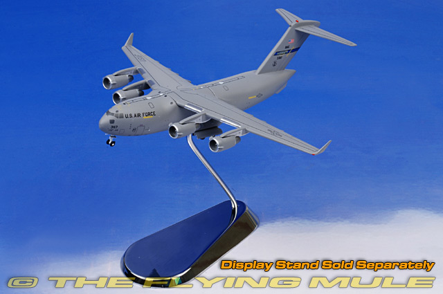 Gemini's 1:400 scale C-17 is constructed almost entirely from diecast metal with only the smallest amount of plastic used. This model's solidly constructed seamless wide-body fuselage features a wonderfully sculpted nose with pad-printed windows and doors that do not interrupt the lines of the aircraft. Both cargo door bay doors articulate at the rear of the model for quick and easy ground display with the pad-printed loading ramp lowered. The solid metal wings feature razor thin winglets that are integrated into the wing casting along with beautifully detailed turbo fan engines with the characteristic aerodynamic strakes atop the engine nacelles.