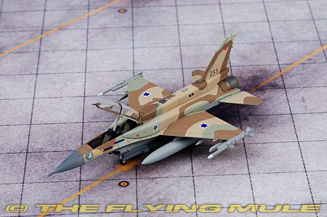The Israeli airforce always possessed the most modern aircraft and it should come as no surprise that the IDAF still today operates some of the world’s best interceptors in the form of the F-16 "Fighting Falcon" developed by General Dynamics. Taken over from Lockheed, this ingenious design was modified for Israel into the F-16i "Sufa" (thunderstorm) in 2003, with more importance attached to range. The combat radius of the "Suva" extends 1,500 kilometers fully armed. Two models with open or closed cockpit cover and different tail design are now released in the 1/200 scale. The model with the open cockpit carries the registration 253 and is limited to 1,500 items. The one with the closed cockpit and the registration 421 is not limited. Please note: Unlike other models in the Herpa Wings series, this model features a permanently opened canopy and cannot be configured with the canopy in the closed position. Designed by General Dynamics as a lightweight, daytime USAF air-combat fighter, the F-16 was first flown on January 20th, 1974. This single-engine, supersonic aircraft has, over the years, evolved into a multirole aircraft. It has a frameless bubble canopy-giving its pilot superior visibility-and it uses advanced aerodynamics. The F-16 was one of the first designs to use a relaxed static stability/fly-by-wire system, which helps it pull 9-g maneuvers and achieve speeds of more than Mach 2. Called "Viper" by its pilots, the F-16 is considered one of the most successful aircraft designs of the Cold War, with 4,400+ aircraft built since 1976. © Copyright 2003-2025 The Flying Mule, Inc. The Herpa "Wings" range presents detailed, ready-made diecast models of civilian and military aircraft. Herpa "Wings" diecast airplanes feature: - Diecast metal construction with some plastic components.