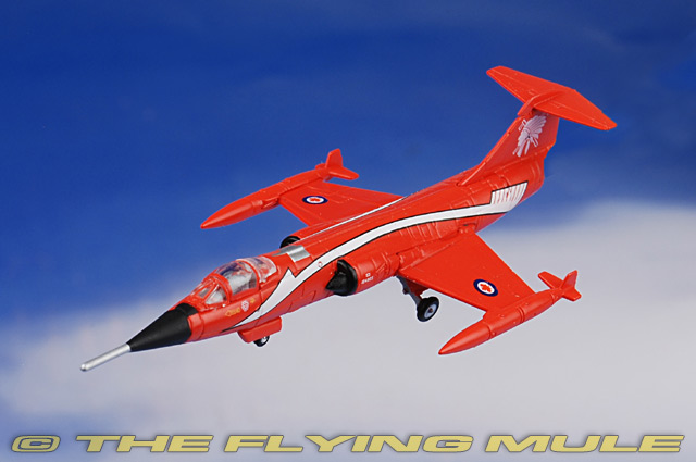 In 1983, the 1st Canadian Air Group based in Baden-Soellingen celebrated its 30th anniversary with this extravagant special livery. Designed to meet a need for an aircraft that could successfully compete against the MiG-15 in Korea, the F-104 Starfighter was first flown on February 20, 1958. American pilots believed that the F-86 Sabre was too large and complex to outmaneuver the lighter MiG, and they wanted a smaller, simpler, high-performance aircraft to replace it. The resulting design was a light, aerodynamic airframe wrapped around a powerful J79 turbojet engine. The F-104C was used by the USAF from 1958 until 1967, but most of the 2,578 production Starfighters were built and flown by members of NATO, including the Italian Air Force, which didn't retire it until 2004. © Copyright 2003-2025 The Flying Mule, Inc. The Herpa "1:200 Wings" range presents detailed, ready-made diecast models of civilian and military aircraft in 1:200 scale. Herpa "1:200 Wings" diecast airplanes feature: - Diecast metal construction with some plastic components.