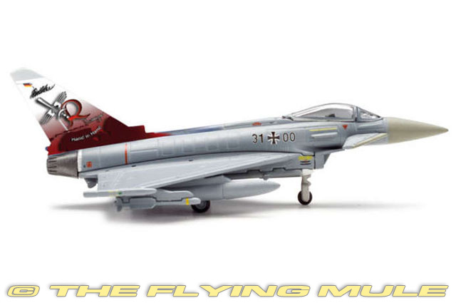 Two special schemes in one: on the left side of the rudder, the 31st Fighter-Bomber Wing, named in honor of the WWI ace Oswald Boelcke, celebrates its 55th anniversary. On the right, the integration of the 71st Fighter Wing into the newly formed 31st Tactical Air Force Wing is commemorated. Designed as part of a co-operative effort by Germany, Italy and the UK to produce an air superiority fighter, the Eurofighter was first flown on March 27th, 1994. The Eurofighter is a single-seat, twin-engine, agile combat aircraft used in air-to-air, air-to-ground and tactical reconnaissance roles. It is intentionally aerodynamically unstable, which gives it its high levels of agility-but this means the Typhoon is controlled by a computerized "fly by wire" system instead of by its pilot. The Eurofighter's first rate performance is matched by excellent all round vision and by sophisticated attack, identification and defense systems and stealth technology. © Copyright 2003-2025 The Flying Mule, Inc. The Herpa "1:200 Wings" range presents detailed, ready-made diecast models of civilian and military aircraft in 1:200 scale. Herpa "1:200 Wings" diecast airplanes feature: - Diecast metal construction with some plastic components.