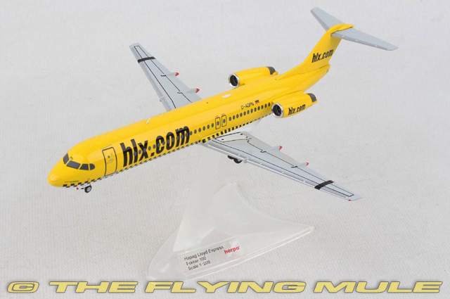 | Fokker F100 | | 7" | | 5.5" | Designed to supercede the F28 Fellowship as a short-range, medium-capacity airliner, the Fokker 100 was first flown on November 30th, 1986. © Copyright 2003-2025 The Flying Mule, Inc. The Herpa "1:200 Wings" range presents detailed, ready-made diecast models of civilian and military aircraft in 1:200 scale. Herpa "1:200 Wings" diecast airplanes feature: - Diecast metal construction with some plastic components.