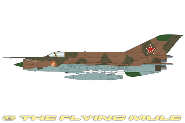 Hobby Master's 1:72 scale MiG-21 is constructed in diecast metal with only the smallest amount of plastic used. The configurable cockpit canopy provides a clear view of the interior and pilot figure and the central air brake is deployable. A G-P9 cannon pod with hand-painted 23mm twin-barrel 23mm can be seen below the cockpit. The wing is crafted of solid metal, and structural details can be seen inside the wheel wells and inboard gear doors. Each wingtip has an integrated fence and air date sensors. Ordnance includes removable fuel tanks and K-13A air-to-air missiles.