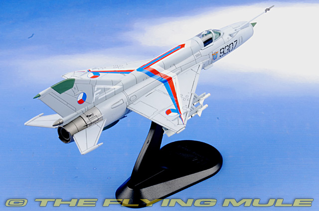 Hobby Master's 1:72 scale MiG-21 is constructed in diecast metal with only the smallest amount of plastic used. The configurable cockpit canopy provides a clear view of the interior and pilot figure and the central air brake is deployable. A G-P9 cannon pod with hand-painted 23mm twin-barrel 23mm can be seen below the cockpit. The wing is crafted of solid metal, and structural details can be seen inside the wheel wells and inboard gear doors. Each wingtip has an integrated fence and air date sensors. Ordnance includes removable fuel tanks and K-13A air-to-air missiles.