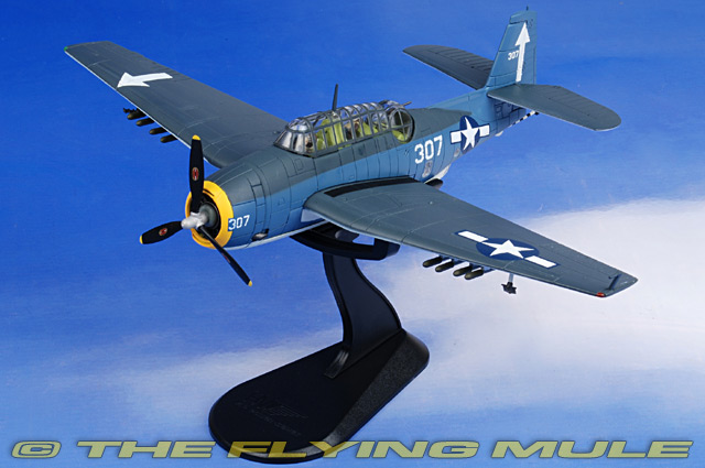 Hobby Master's 1:72 scale TBF Avenger has a large, solid-metal wing, with only a small amount of plastic used on the metal fuselage. The large birdcage canopy can be removed to reveal pad printed dials and gauges, control stick, pilot and seat and radioman/bombardier seat. The non-movable framed rear ball turret has a rear facing machine gun, and the ventral gunner station has a machine gun and transparent widow. The bomb bay doors can be opened, and the model can be fitted with either four 500 lb bombs or a torpedo. Each release has an accurate pitot tube and radar antennas, and some releases include rockets and radar dome.