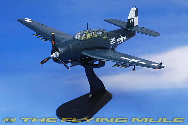 Hobby Master's 1:72 scale TBF Avenger has a large, solid-metal wing, with only a small amount of plastic used on the metal fuselage. The large birdcage canopy can be removed to reveal pad printed dials and gauges, control stick, pilot and seat and radioman/bombardier seat. The non-movable framed rear ball turret has a rear facing machine gun, and the ventral gunner station has a machine gun and transparent widow. The bomb bay doors can be opened, and the model can be fitted with either four 500 lb bombs or a torpedo. Each release has an accurate pitot tube and radar antennas, and some releases include rockets and radar dome.