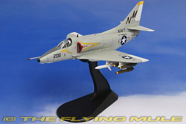 Hobby Master's 1:72 scale A-4 Skyhawk is a sturdy model constructed almost entirely from diecast metal with only the smallest amount of plastic used. This model has an opening canopy with pad-printed dials and gauges, control stick and pilot seat. Each release features a pair of 20mm cannons, a delicate refueling probe and a variety of wing-mounted weapons ordnance and fuel tanks. The series includes the early B and E variants as well as the F and M variants, which have a hump on the top of the fuselage to house upgraded avionics (also seen on retrofitted E variants).